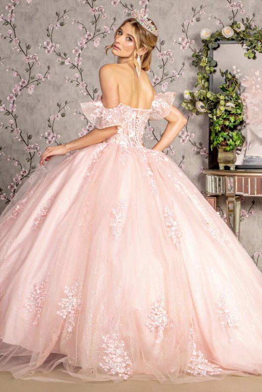 فستان Quinceanera شبكي مزين بالزهور ثلاثي الأبعاد مع أكمام قصيرة قابلة للفصل