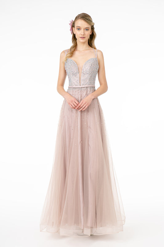 فستان طويل مزين بالخرز وياقة عميقة من إليزابيث ك