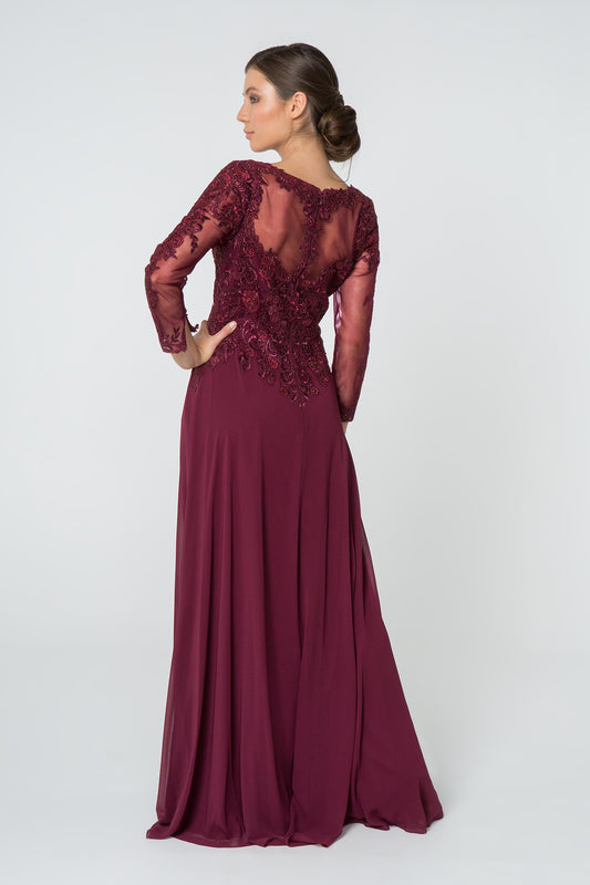 فستان طويل من الشيفون مزين بالدانتيل مع أكمام شبكية