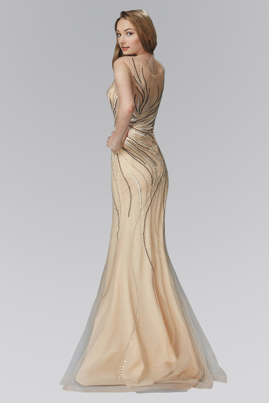 Bead and Lace Embellished Chiffon Long Dress with Sheer Bodice