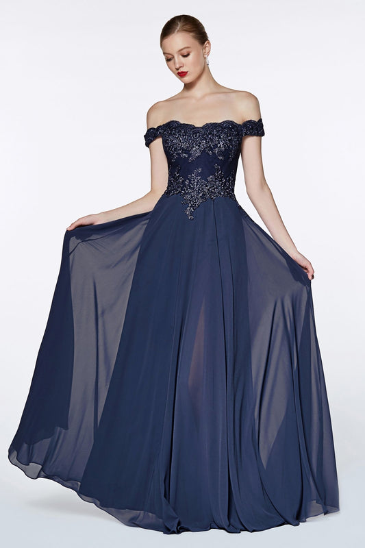 فستان من الدانتيل مكشوف الكتفين مع فتحة سفلية من الشيفون المتدفق وبطانة في الساق.