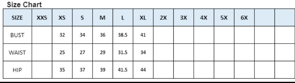 | حجم أمريكي | XXS | XS | س | م | ل | XL | 2X | 3X | 4X | 5X | 6X | |