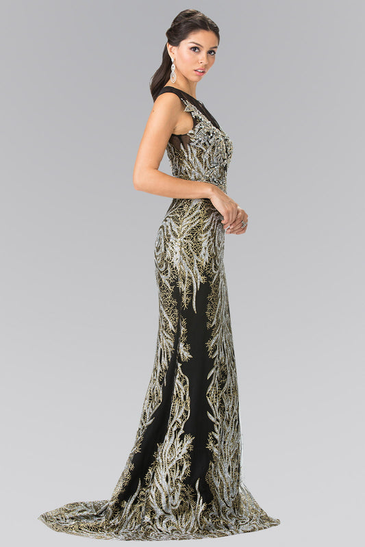 Beaded Floor Length Dress with Sheer Bodice and Open Back