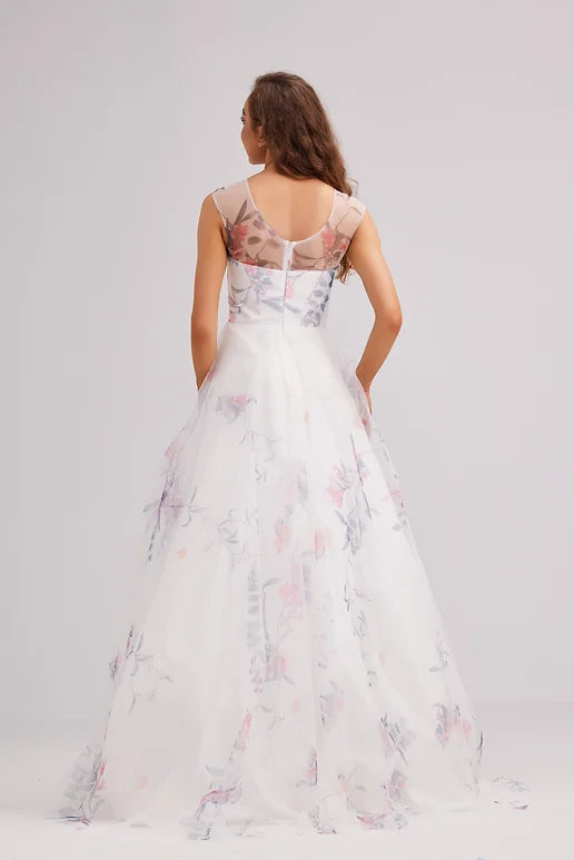 3-D Flower Glitter Sheer Neckline Mesh Mermaid Long Dress