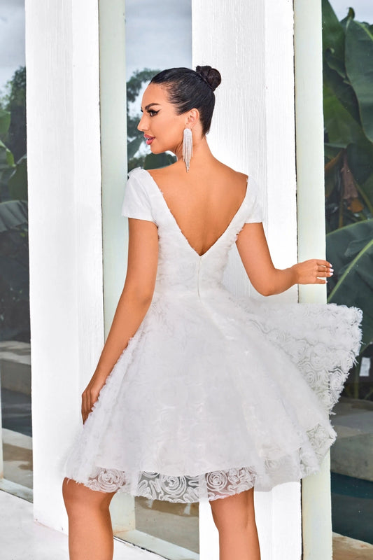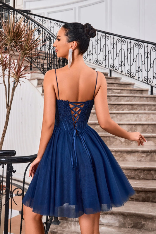 Glitter Embellished Bodice V-Neck Tulle Short Dress