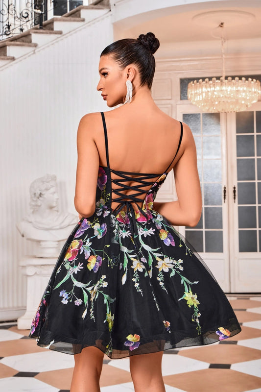 Embroidery Embellished Bodice Glitter Pattern Mesh Skirt Short Dress