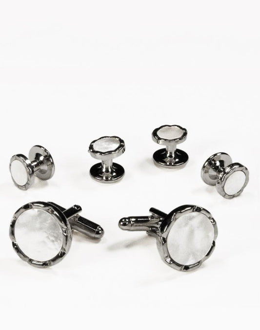 White Circular Mother of Pearl with Gold or Silver Diamond Cut Edge Studs and Cufflinks Set