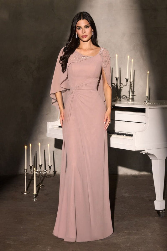 Classic Column Silhouette with Soft Draped Overlay and Cape-Style Sleeves