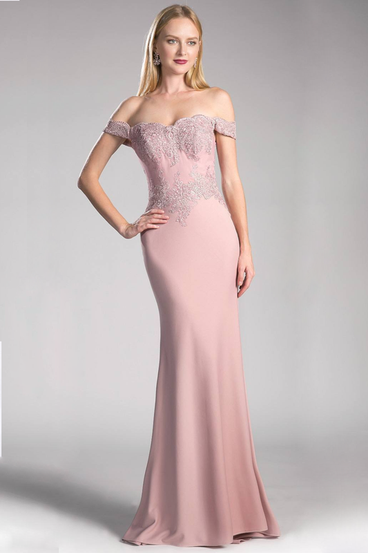 Off the Shoulder Fitted Gown with Lace Applique Details and Stretch Jersey