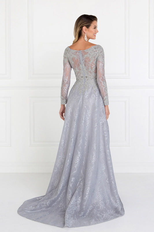 V-Neck Long Sheer Sleeve Chiffon Floor Length Dress with Lace Bodice