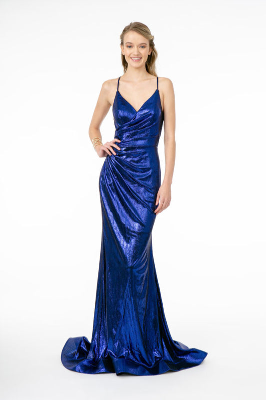 Ruched Metallic Lame V-Neck Mermaid Long Dress w/ Lace Up Back
