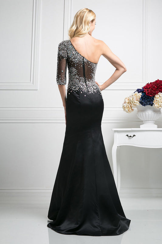 Fitted stretch jersey gown with beaded illusion details and sweetheart neckline.