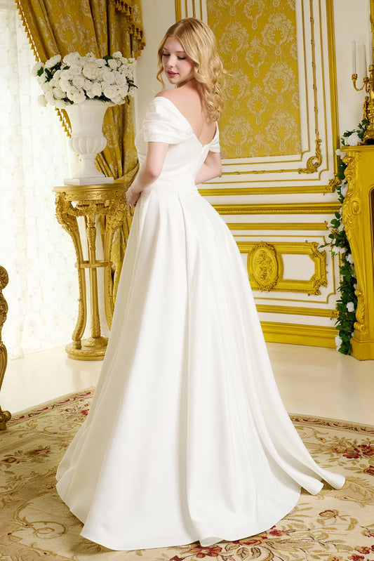 Satin Wedding Gown A Minimalist Aesthetic Off-The-Shoulder Sleeves