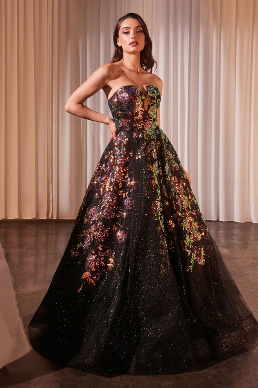 Strapless Glitter Floral Print Gown With Detachable Puff Sleeves