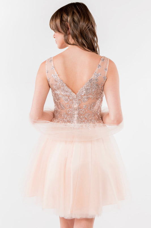 Glitter Embellished Bodice V-Neck Tulle Short Dress
