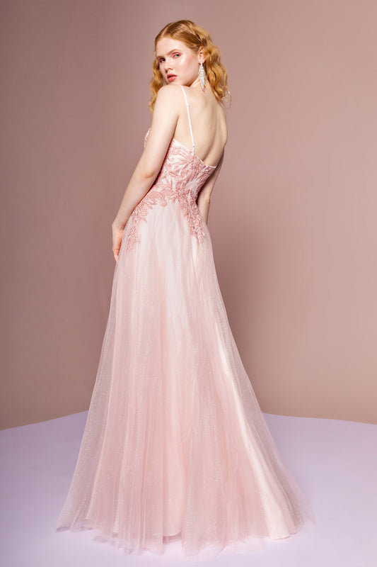Glitter Mesh Illusion Deep V-Neck Long Dress w/ Slit
