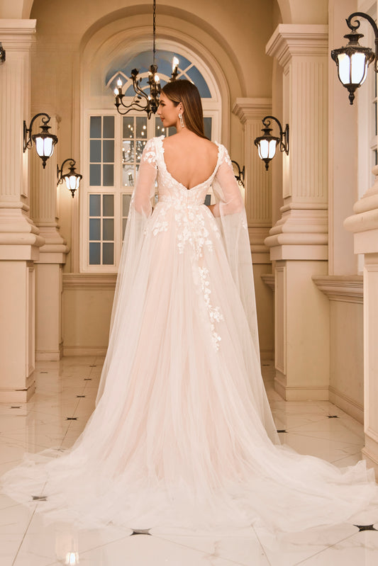 Embroidered V-Neck Mermaid Wedding Gown w/ Detachable Cape - Mask Not Included