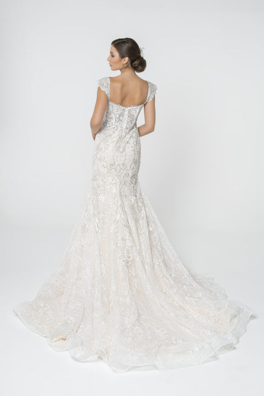 Illusion V-Neck Embroidered Mesh Wedding Gown w/ Sequin Lining