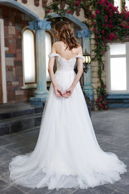 Wedding Ball Gown An Off-The-Shoulder Illusion Bodice Adorned With Cascading Floral Lace Appliqué And Dimensional Textures