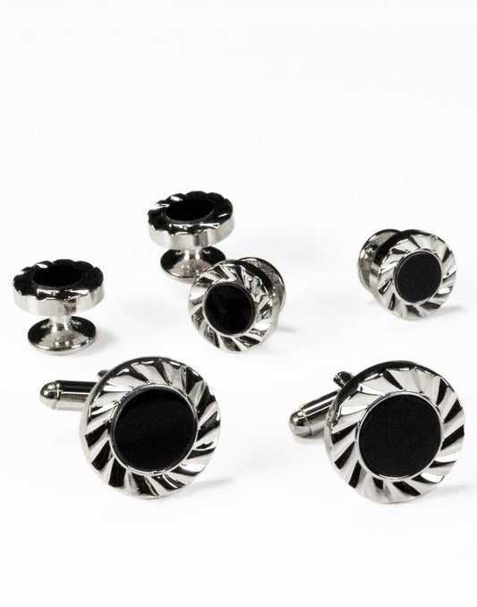 Black Circular Onyx with Silver Facet Cut Edge Studs and Cufflinks Set
