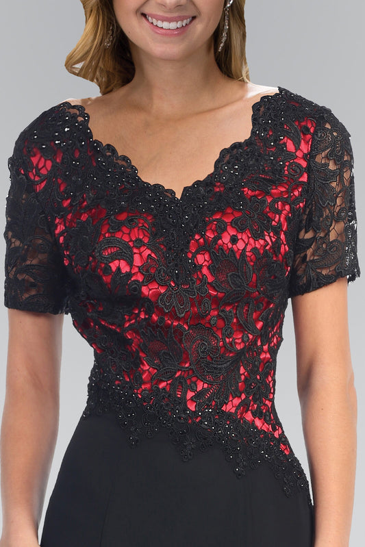 Short Sleeve V-Neck Long Dress with Lace Bodice