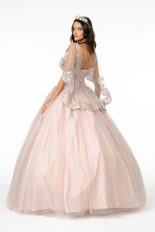 V-Neck Glitter Mesh Ball Gown w/ Cape Sleeve