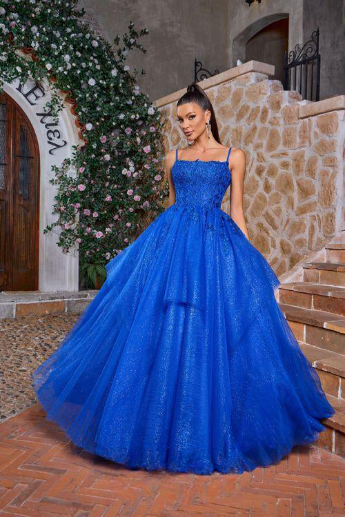Elevate your elegance with J26001, an exquisite A-Line prom ball gown. Boasting a delicate lace corset and spaghetti straps, this dress glides over your curves in regal purple, ice pink, and royal hues. Perfect for any special occasion, this dress exudes luxury and sophistication.