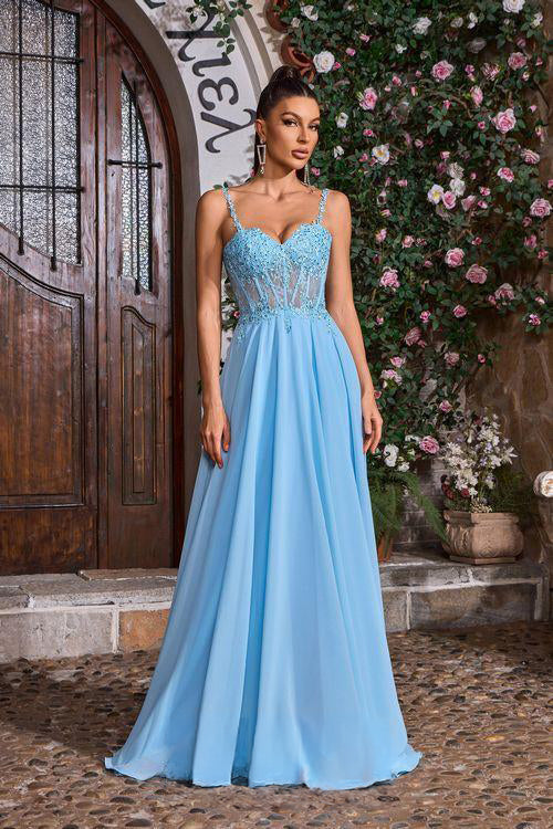 Embrace your inner goddess with our J26026 dress. The sweetheart neckline and delicate spaghetti straps add a touch of femininity, while the navy lace and ivory accents bring a romantic feel. The illusion floral details and desert blue corset complete this luxurious A-line gown. Make a statement with the back straps and open back, perfect for any prom or special occasion.