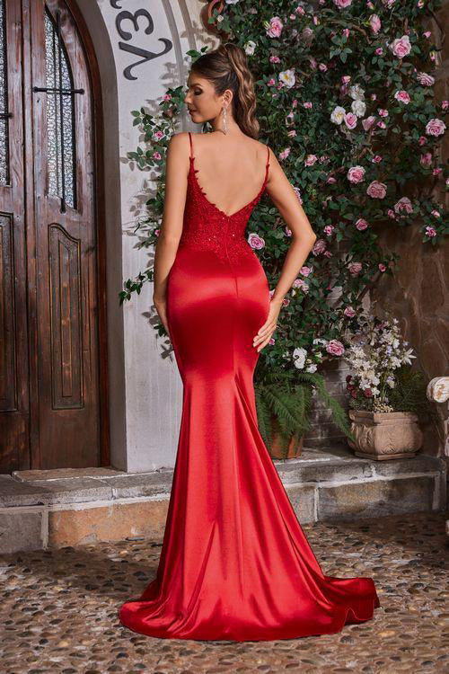 Introducing our J26038 dress, featuring a classic V-neck and delicate straps for a feminine touch. Perfect for special occasions, this A-line design accentuates your figure with a mermaid silhouette. The lace detailing and open back add a touch of romance. Available in rich red, sage, and black. Elevate your style with this exclusive dress.
