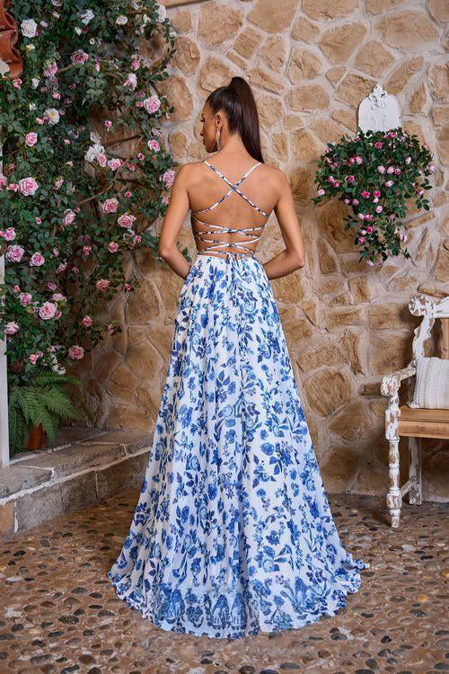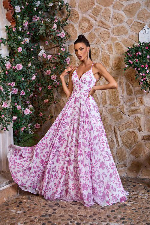 Make a statement at Prom with J26044. This A-Line dress features a delicate pink and blue floral print with intricate stamped details. The back straps and open design add a touch of sophistication, while the V-neck and spaghetti straps create a flattering silhouette. Pockets provide convenience without sacrificing style. Elevate your look and make a lasting impression in this truly unique dress.