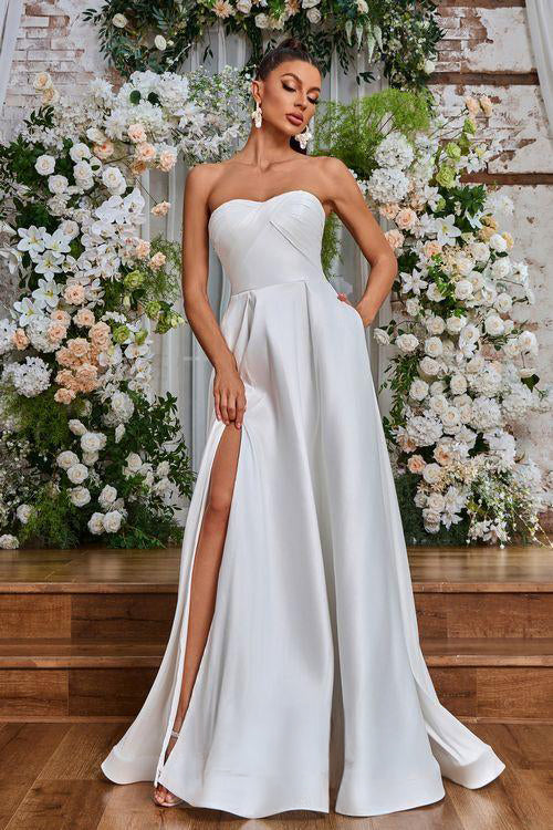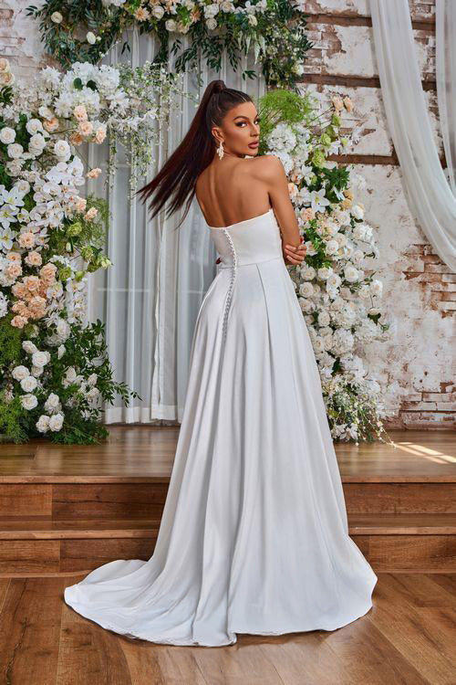 Indulge in luxury with our JA8002 wedding dress. This stunning strapless gown features a sensuous leg slit and a classic ivory color, perfect for a timeless look. Walk down the aisle in style with its floor-length design and delicate buttons. And for a touch of practicality, hidden pockets are included. Embrace your sweetheart neckline in this exclusive piece.