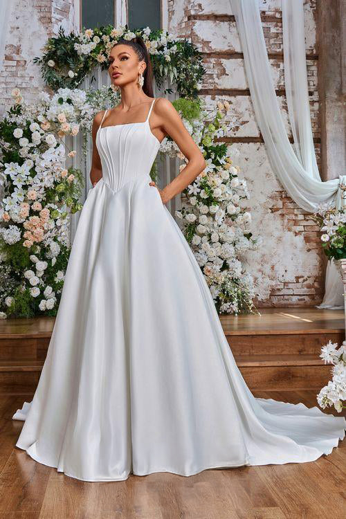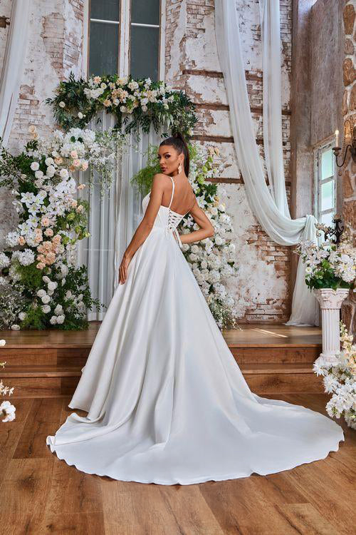 Indulge in luxury with our JA8005 wedding dress. Exuding elegance with its sleek A-line silhouette, this ivory beauty features a corseted bodice with a delicate square-neck and spaghetti straps. Pockets and a floor-length hem complete the sophisticated design. Say "I do" in style.
