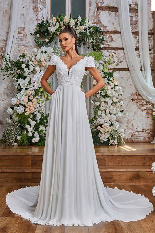 Embrace timeless elegance with JA8011, a stunning ivory A-Line wedding gown. The delicate lace detailing and V-Neckline add a touch of romance, while the floor length and short sleeves create a classic silhouette. Complete the look with delicate button accents for a truly luxurious feel.