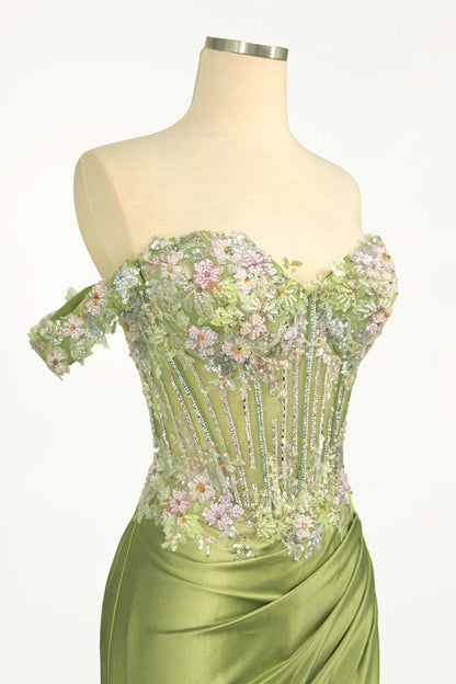 This fitted gown radiates elegance with its off-the-shoulder sweetheart neckline and a sheer floral-embellished bodice adorned with intricate beading. The satin skirt flows gracefully, featuring a leg slit for added allure, while the structured bodice and lace-up corset back ensure a perfect fit. Ideal for prom, formal events, or black-tie affairs, this dress brings refined sophistication to any occasion.