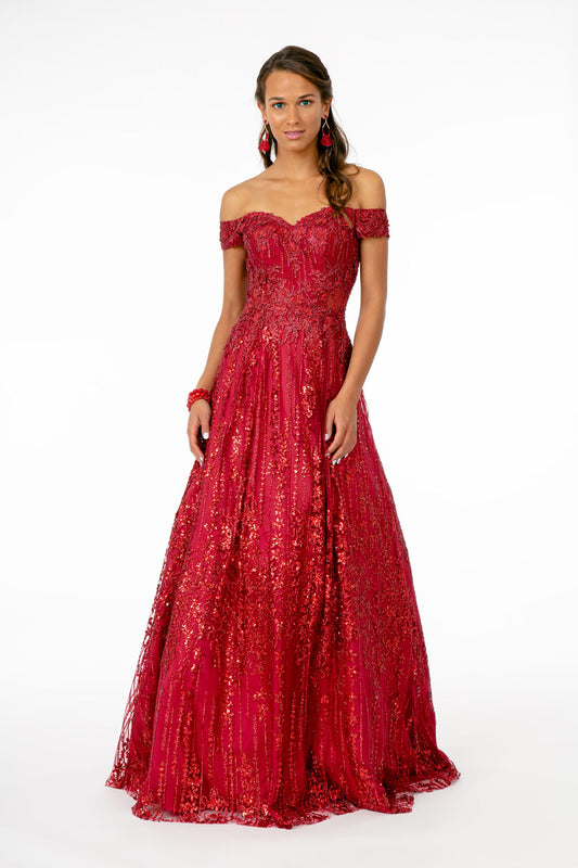 Embroidered Bodice Cut-Away Shoulder Glitter Mesh Wedding Gown w/ Sequin Mesh Lining