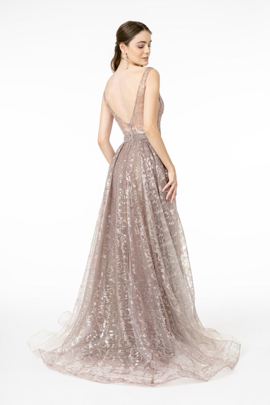 Embroidered Mesh A-Line Long Dress w/ V-Back