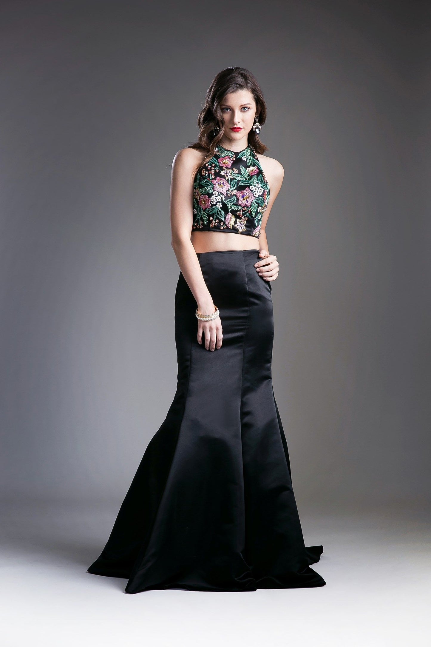 Indulge in luxury with our Beaded 2 Piece Satin Mermaid Gown. Its sleeveless and halter design exudes elegance, while the floral details add a touch of artistry. The back open and two-piece style are both unique and alluring. Black satin and spaghetti straps complete this exclusive look. Perfect for prom or any special event.