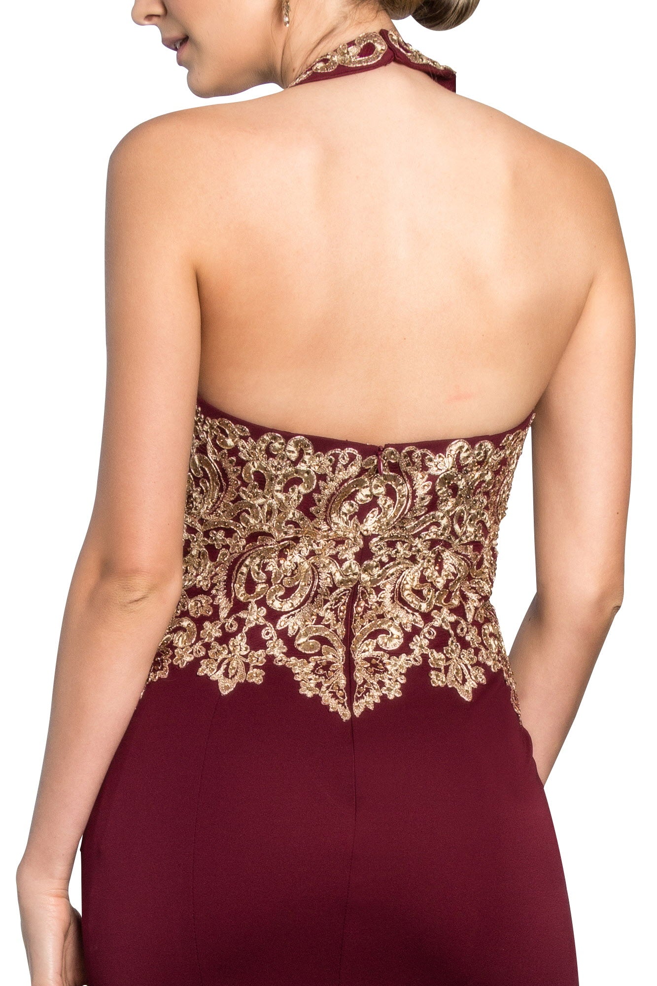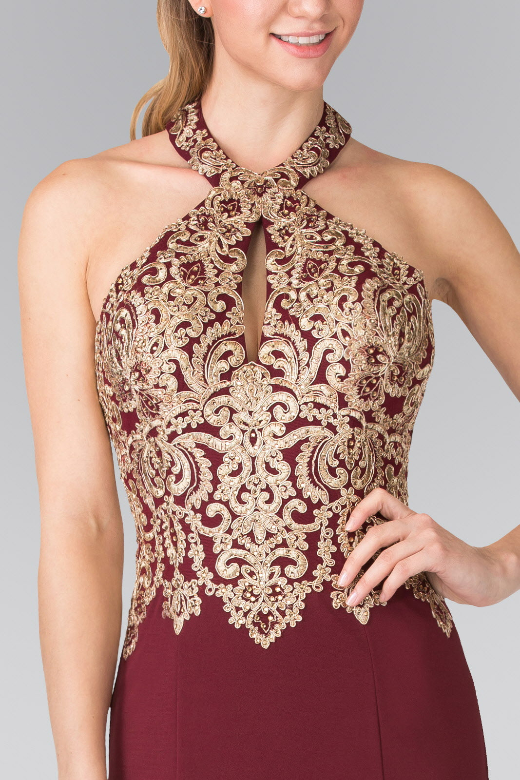 Embroidered Neck Halter Jersey Long Dress with Open Back