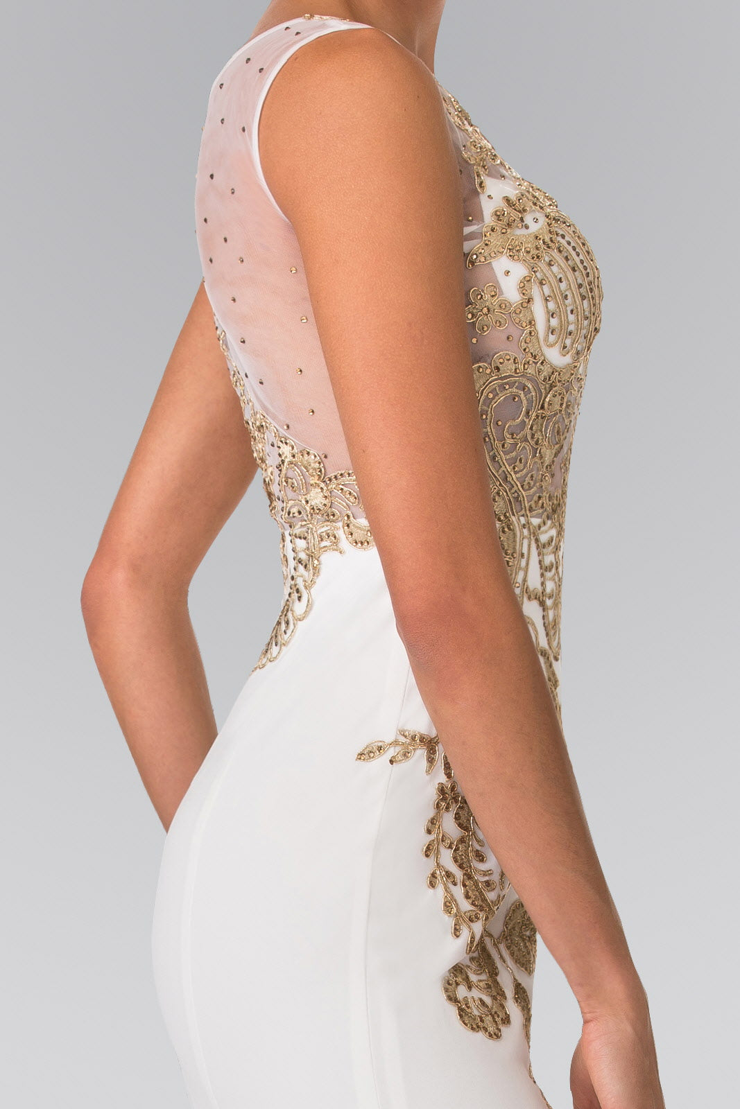 Elevate your style with our Embroidered Sleeveless Long Jersey Dress. This stunning prom dress features intricate embroidery and beading on a sheer bodice, balanced by a classic boat-neck and mermaid silhouette. Available in royal blue, black, and ivory for a touch of sophistication.