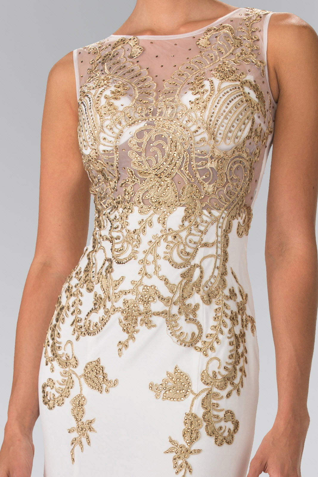 Embroidered Sleeveless Long Jersey Dress with Sheer Bodice
