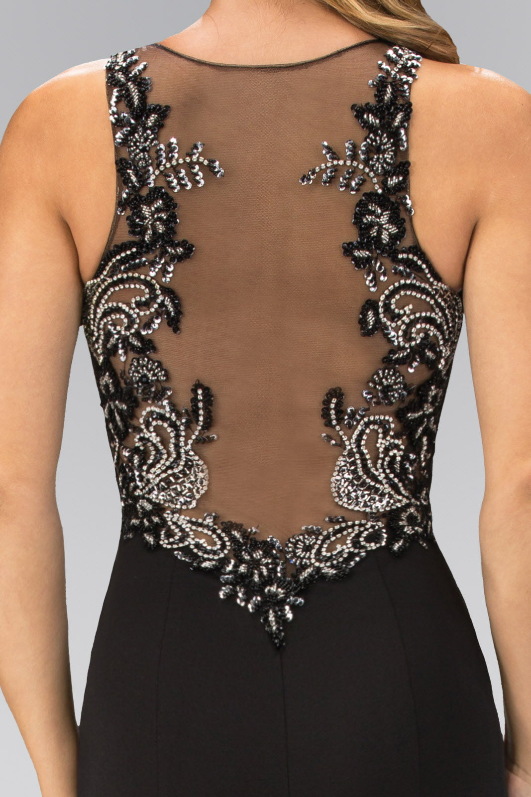This elegant Floor Length Rome Jersey Dress features a striking jewel embellished neckline and a flattering trumpet silhouette. Sleeveless with a scoop-neck and a back zipper for easy wear, the sheer back adds a touch of drama. Available in red and black, this dress is perfect for prom or any special occasion.
