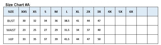 | US SIZE | XXS | XS | S | M | L | XL | 2X | 3X | 4X | 5X | 6X | |