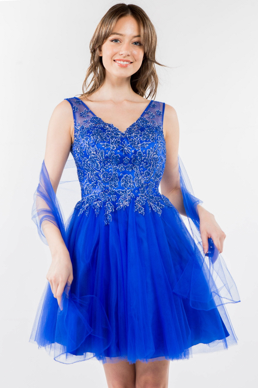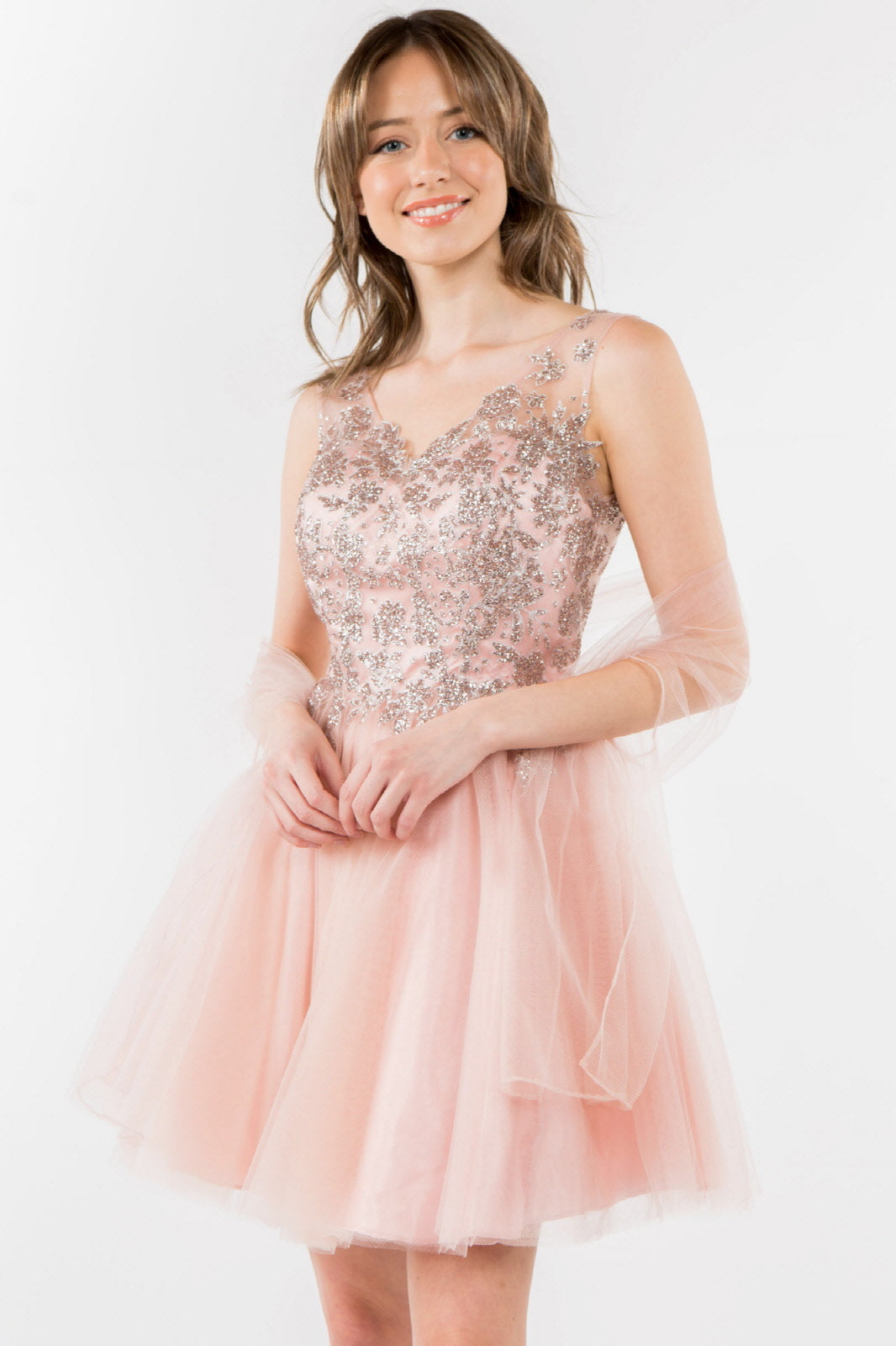 Glitter Embellished Bodice V-Neck Tulle Short Dress