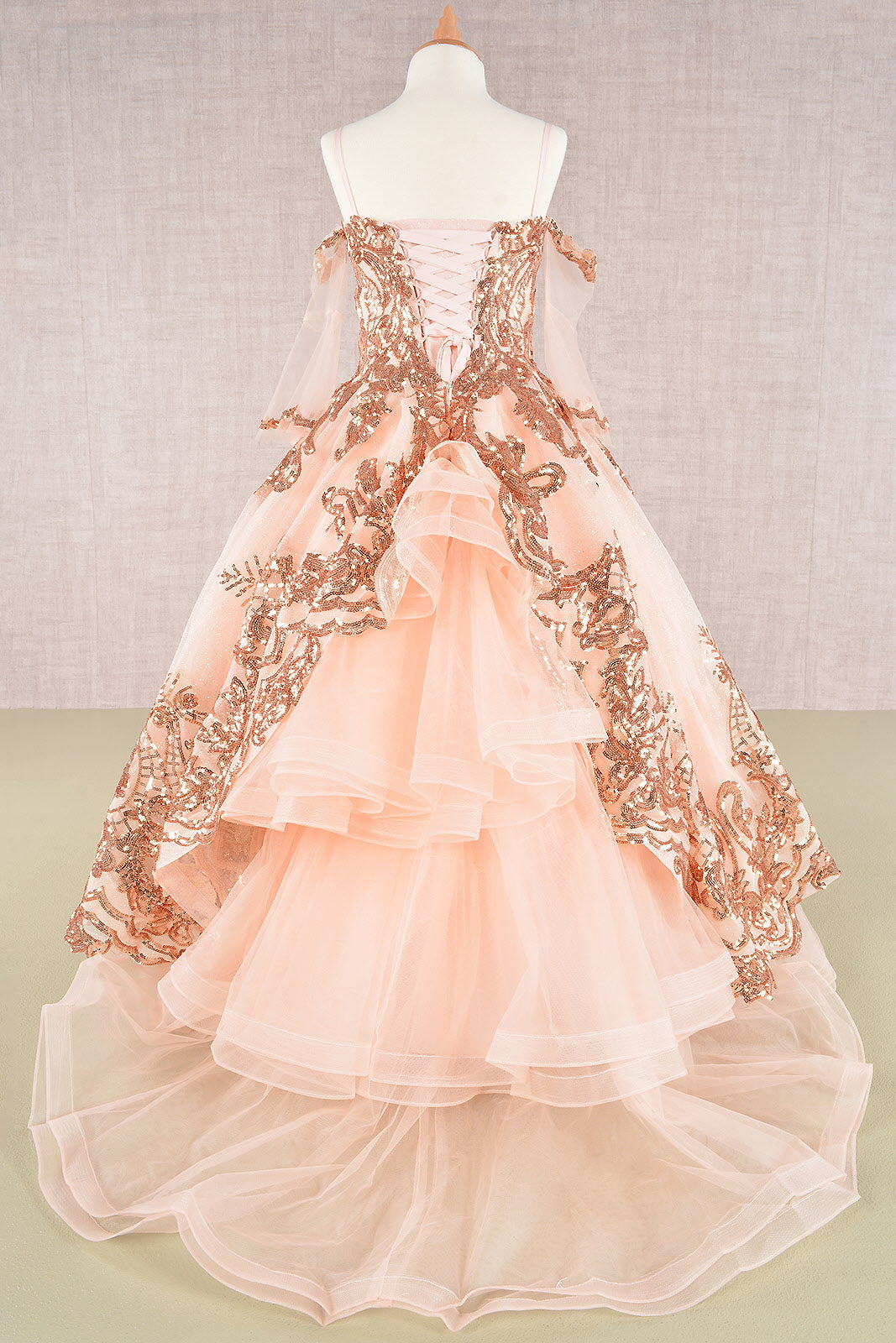 Introducing our luxurious Glitter Sequin Embellished Mesh Kids Dress, perfect for your little fashionista. Featuring a sweetheart neckline, spaghetti straps, and a corset bodice, this ball gown exudes elegance and style. The back zipper allows for easy dressing while the separate mesh 3/4 sleeves add a touch of sophistication. MyKids-USA™ brings you this dress in three stunning colors: champagne/rose gold, royal blue, and red. Elevate your child's wardrobe with this exclusive and glamorous dress.