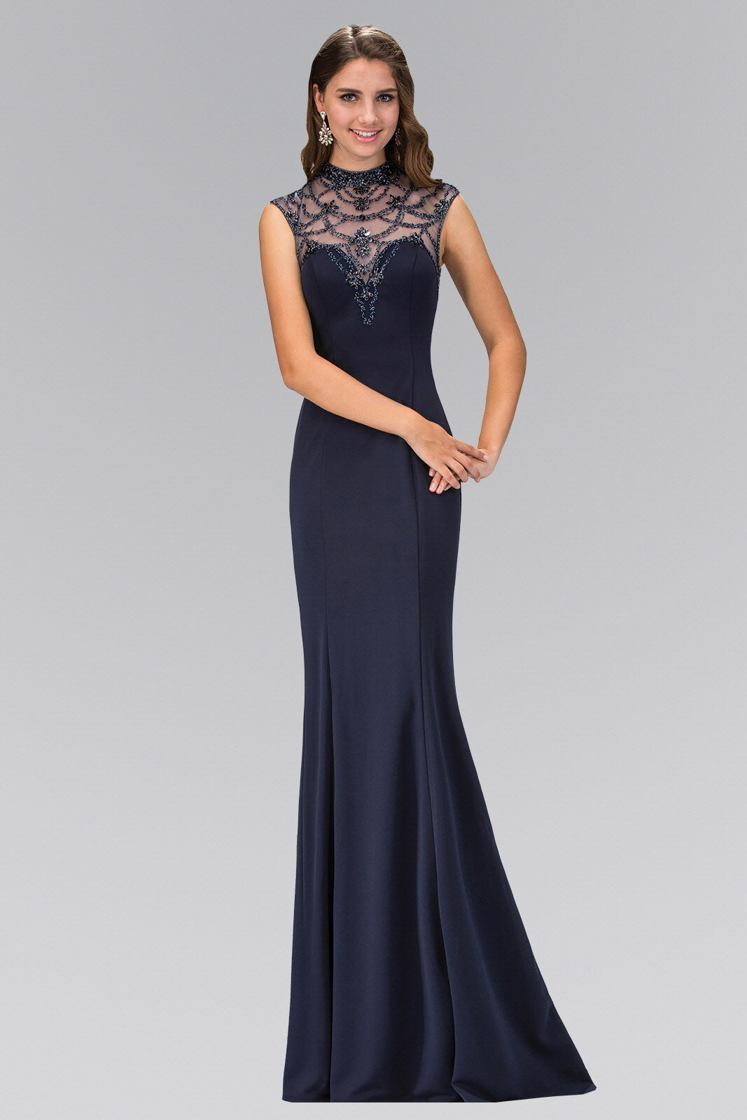 Highneck Navy Long Jersey Dress with Bead Detaiing
