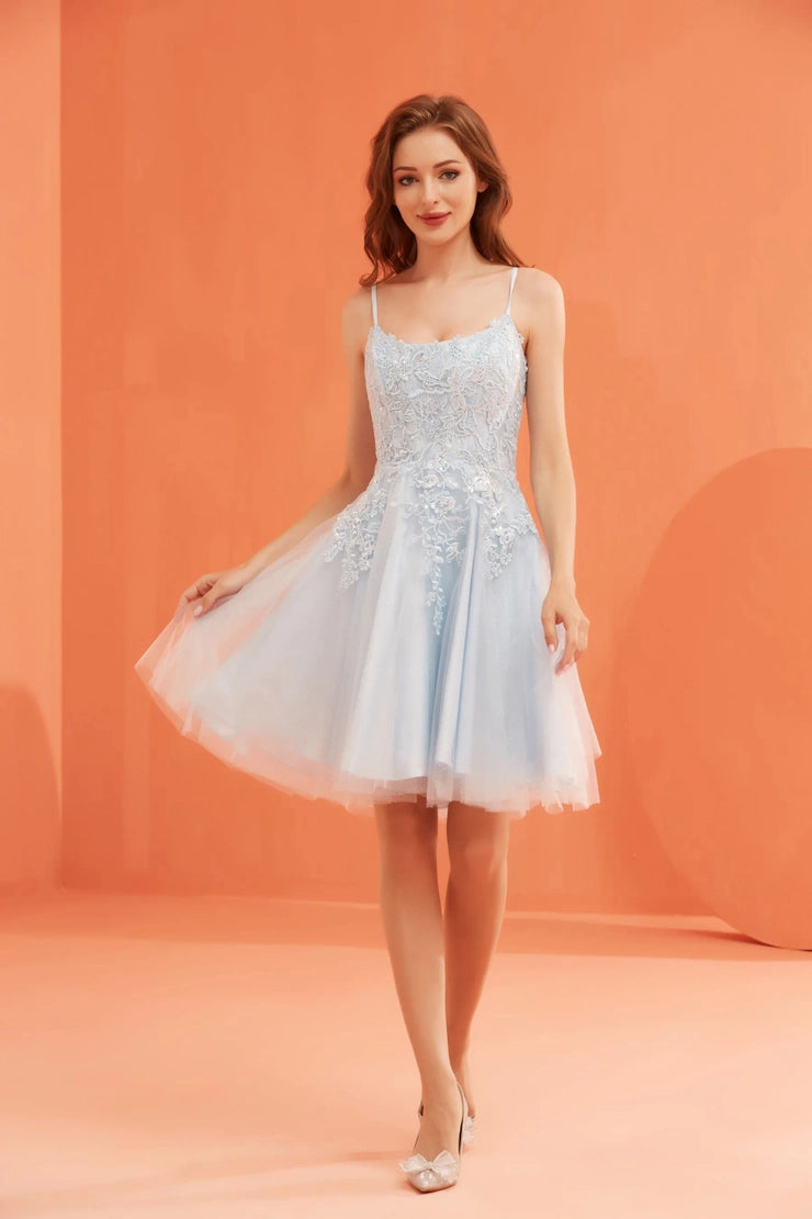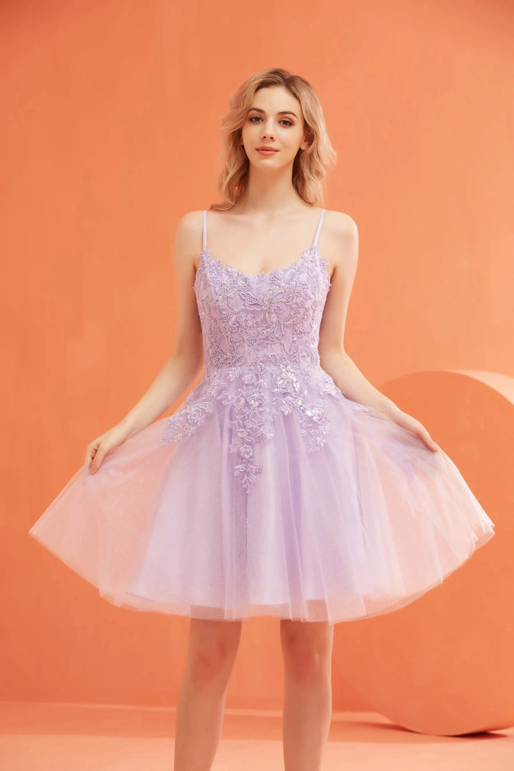Indulge in the luxurious charm of J22086. This elegant Tea Length dress features delicate Spaghetti Straps and a flattering A-Line silhouette. The stunning combination of Violet and Light Blue hues adds a touch of sophistication. Perfect for any special occasion, this Damas/Short dress is a must-have for your wardrobe.