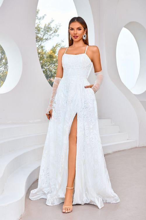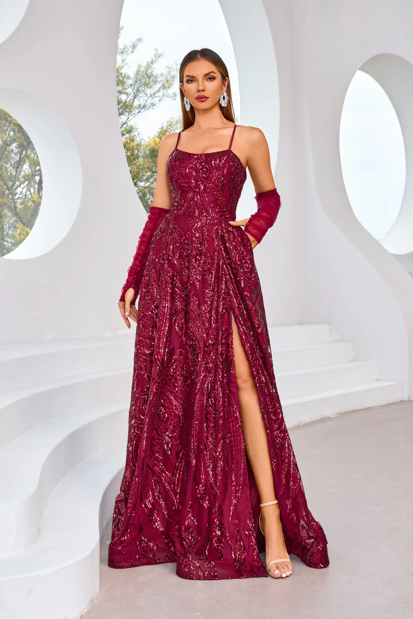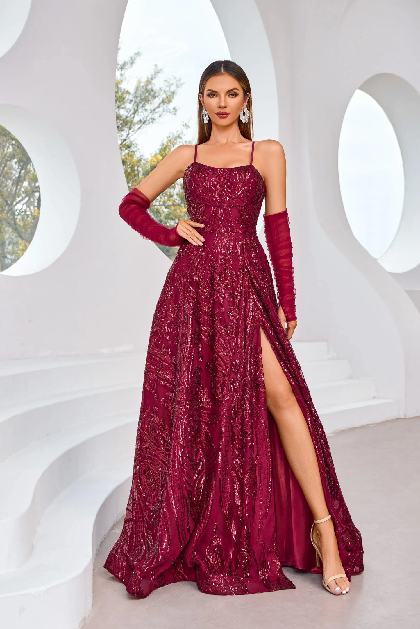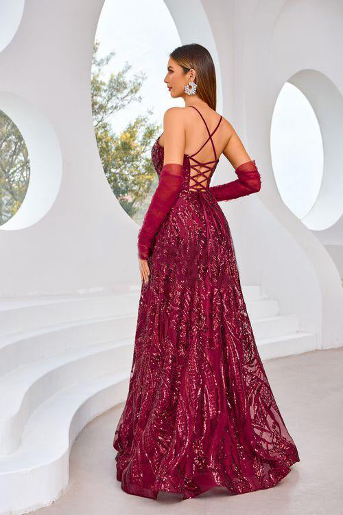 The J25031 dress is perfect for any special occasion. With its elegant spaghetti straps and removable sleeves, it offers versatility and style. The A-line silhouette flatters any figure and comes in a sophisticated color palette of navy, wine, and ivory. Embrace luxury and exclusivity with this dress.