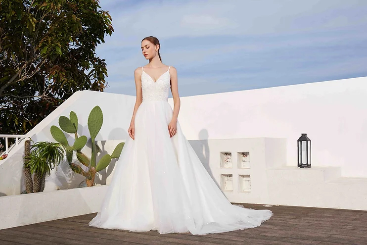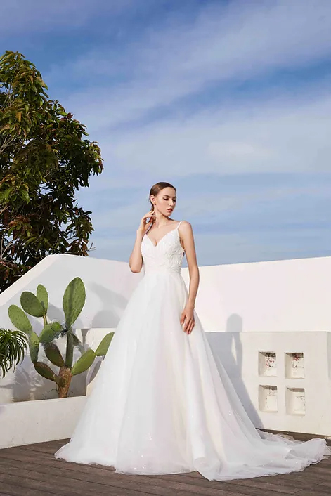 Introducing the JE408 - a wedding dress that exudes luxury and sophistication. With a V-neckline and delicate spaghetti straps, this A-line gown flatters all body types. The luxe ivory fabric adds an elegant touch to your special day. Be a vision of beauty in the JE408.