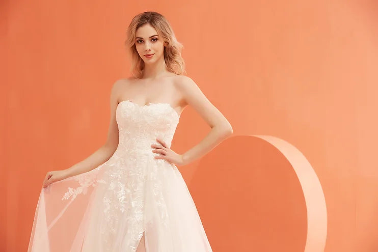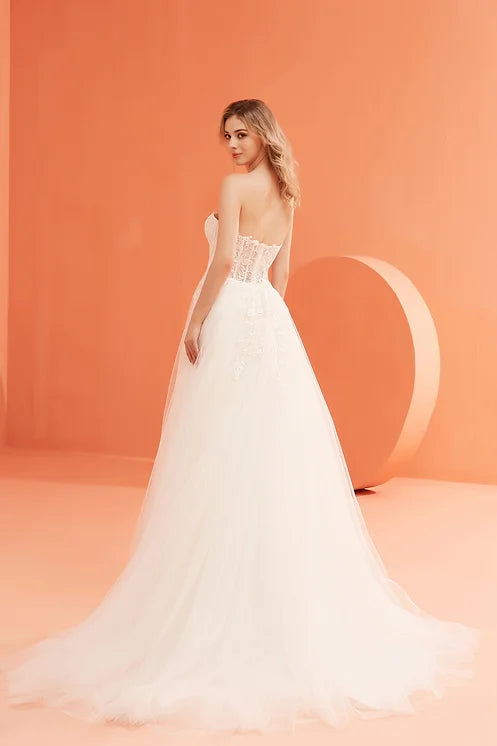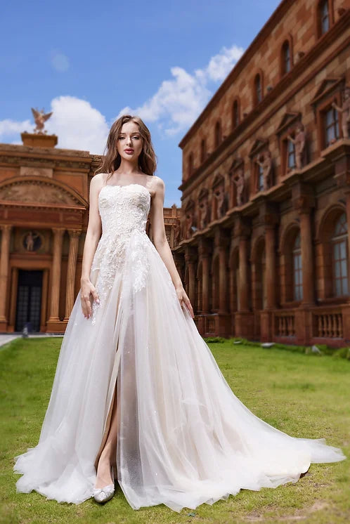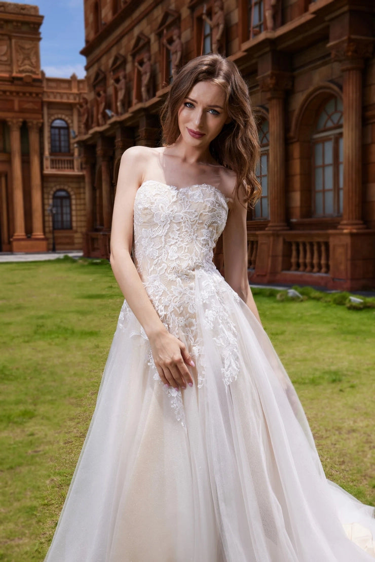Introducing JE804, the epitome of luxury and sophistication. This stunning A-Line wedding dress features a strapless design, adding a touch of elegance to your special day. The luxe ivory and nude color combination exudes class and exclusivity. Say "I do" in style with JE804.
