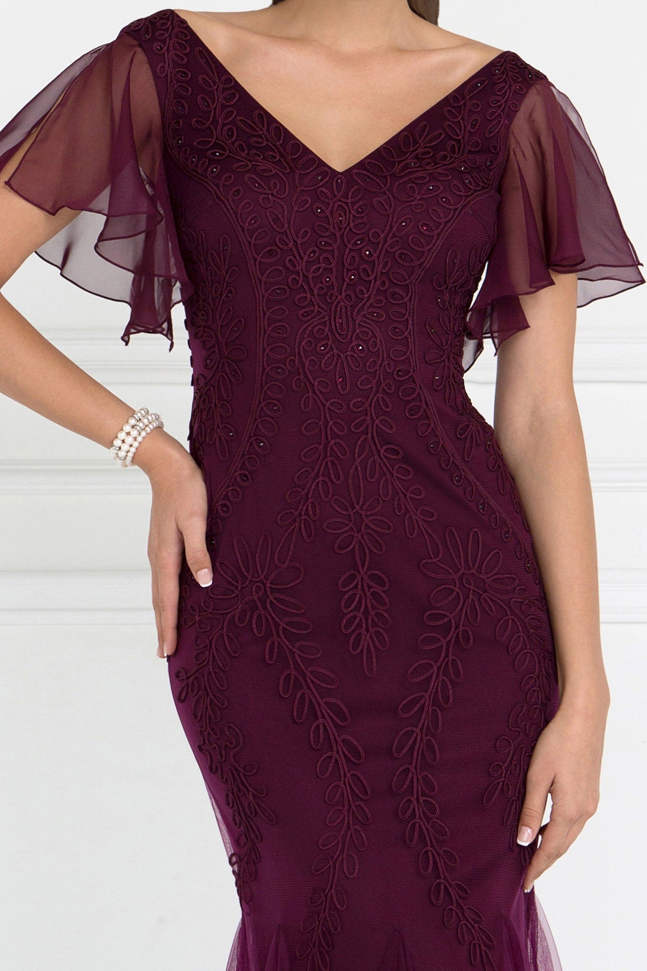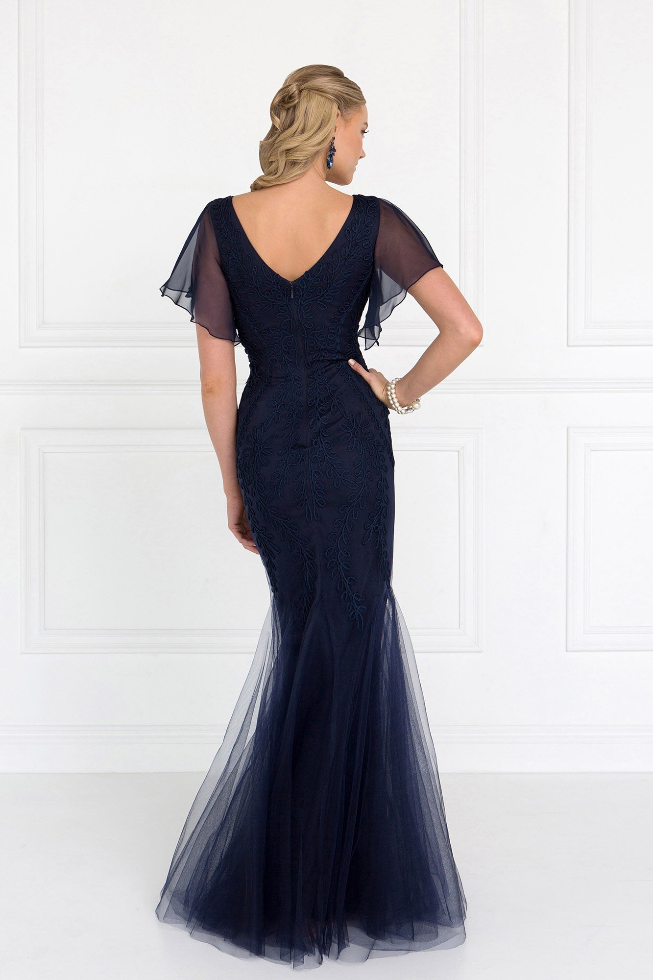 Elevate your formal look with our Tulle V-Neck Trumpet Long Dress. Featuring intricate embroidery and a sparkling jewel accent, this dress exudes elegance. Short sleeves and a V-back add a touch of sophistication, while the trumpet silhouette flatters your figure. Available in Eggplant, Navy, and Silver. Perfect for prom or any special occasion.